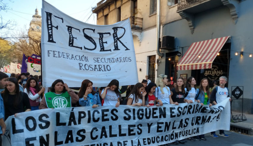 La tarde, casi primaveral –la movilización comienza pasadas las 18–, se presenta ideal para darle con ganas al bombo y al redoblante. Hay mucha musculosa y ropa suelta. A la cabeza de la manifestación, en alto, una bandera dice “Federación Secundarios de Rosario”. Abajo, de barredora, otra asegura que “los lápices siguen escribiendo, en las calles y en las urnas”.