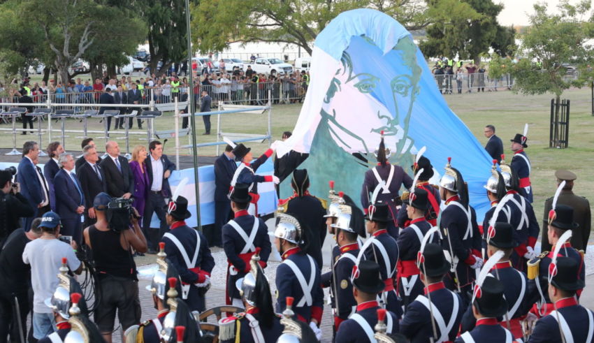 Todo estaba dispuesto para las 18 en el Parque a la Bandera, frente al monumento de jurisdicción federal que recuerda la creación del emblema nacional: el escenario minimalista de espaldas al río Paraná apenas vestido con un puñado de butacas sin respaldo; la banda militar Tambor de Tacuarí; los granaderos del Regimiento de Infantería 1 de Patricios; los invitados especiales ocupando sus lugares; la escultura de Belgrano hecha con 700 kilos de chapa naval de 16 milímetros por los y las trabajadoras del Astillero Tandanor; el corralito de prensa poblado de trabajadores de esa actividad; la gente movilizada para asistir al acto; el sol que calentaba –por momentos demasiado- la escena conmemorativa.