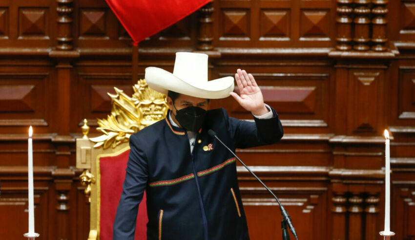 “Juro por Dios, por mi familia, por mis hermanas y hermanos peruanos, campesinos, pueblos originarios, ronderos, pescadores, docentes, profesionales, niños, jóvenes y mujeres, que ejerceré el cargo de presidente de la República por el periodo 2021-2016. Juro por los pueblos del Perú, por un país sin corrupción y por una nueva Constitución”, afirmó Castillo en la ceremonia de asunción de la presidencia, con su tradicional sombrero blanco de campesino y un traje con motivos andinos.