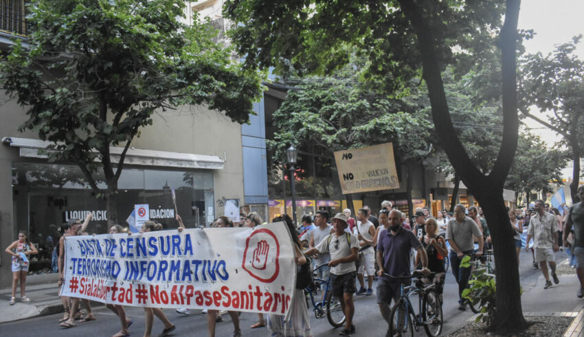 El calor era sofocante, como corresponde a enero en la ciudad, y el no-al-pase mutó a so-mos-libres, manteniendo el ritmo y con la misma métrica. Algunos autos hacían sonar sus bocinas, una pancarta denunciaba “Dictadura sanitaria” y carteles confeccionados a mano en cartón corrugado exhibían frases de Manuel Belgrano y San Martín. Otros iban más allá y en letras impresas declaraban “No al pase nazitario”, mientras algunos gritaban vivas a la patria o vociferaban li-ber-tad, sobre la misma base rítmica y monótona, como un mantra o algo que a fuerza de repetición se vuelve un significante vacío, al menos para este cronista.