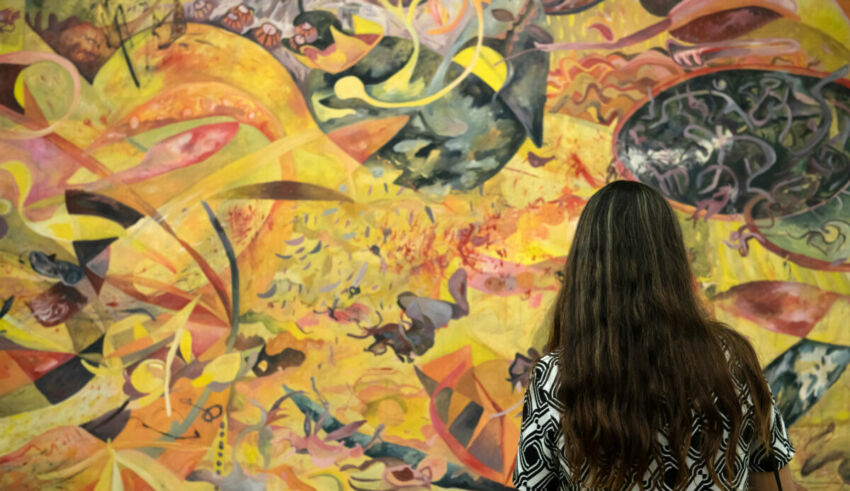 Para Emi Díaz, el agua también es un elemento central. En sus pinturas de personas sumergidas las imágenes fugaces son la regla. En esta ocasión, su tela enfatiza el movimiento ondulante a través del montaje y una luz rasante de color cyan.