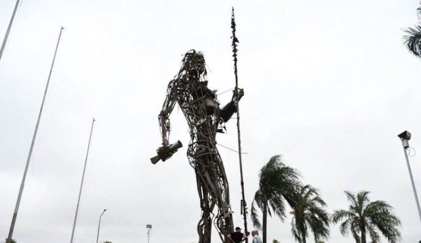 Hace apenas días –el 18 de noviembre– un temporal de vientos golpeó a la costanera correntina y en ella al complejo escultural y monumento a Andresito. Obra erigida en 2014 de 17 metros de altura y más de 15 toneladas de hierro, los restos fueron donados por la minoría regional o atesorados en fondos del Paraná y reciclado por el grupo Cultura Vallese.
