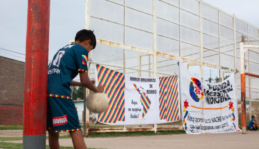 Dos cuadras hacia el sur de Rouillón al 4300, la canchita del playón hierve de pibitos que corren detrás de una pelota. Un nene con la camiseta de Boca pisa la bocha y da indicaciones. Más allá otro con la de remera de la Juventus corre y reclama el pase. En el potrero del barrio qom la tarde está ideal para sentirse Messi. Detrás de uno de los arcos Susana Gauna y Nanci Abalos cuelgan una bandera con el mapa del continente americano pintado con los colores de la wiphala, la bandera de los pueblos originarios, y junto al dibujo una frase: “Aquí se respira lucha”.