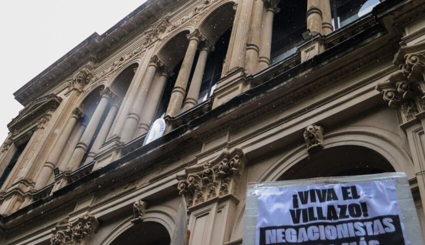 El día amaneció nublado. Un manto gris se dibujaba como cielorraso entre las palmeras del bulevar Oroño. Los gazebos estuvieron presentes en el cantero central para dar cobijo a la militancia que decidió acompañar bajo la lluvia a los familiares y víctimas del terrorismo de Estado en la lectura de la sentencia en la causa conocida como el Villazo. En la galería de ingreso del edificio se instaló un televisor para que los asistentes pudieran seguir de cerca la decisión del tribunal y allí se encontraba otro grupo numeroso de militantes.